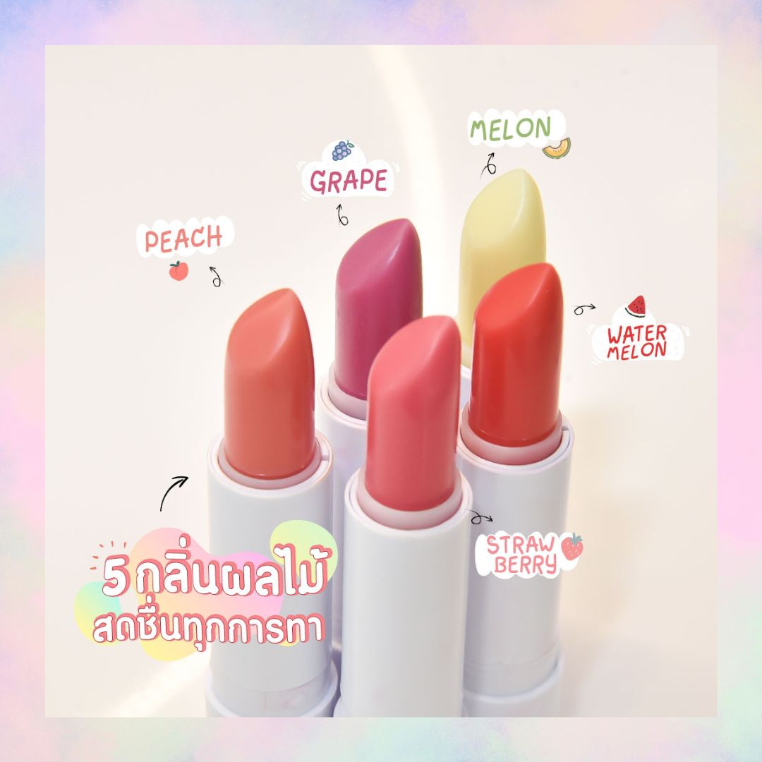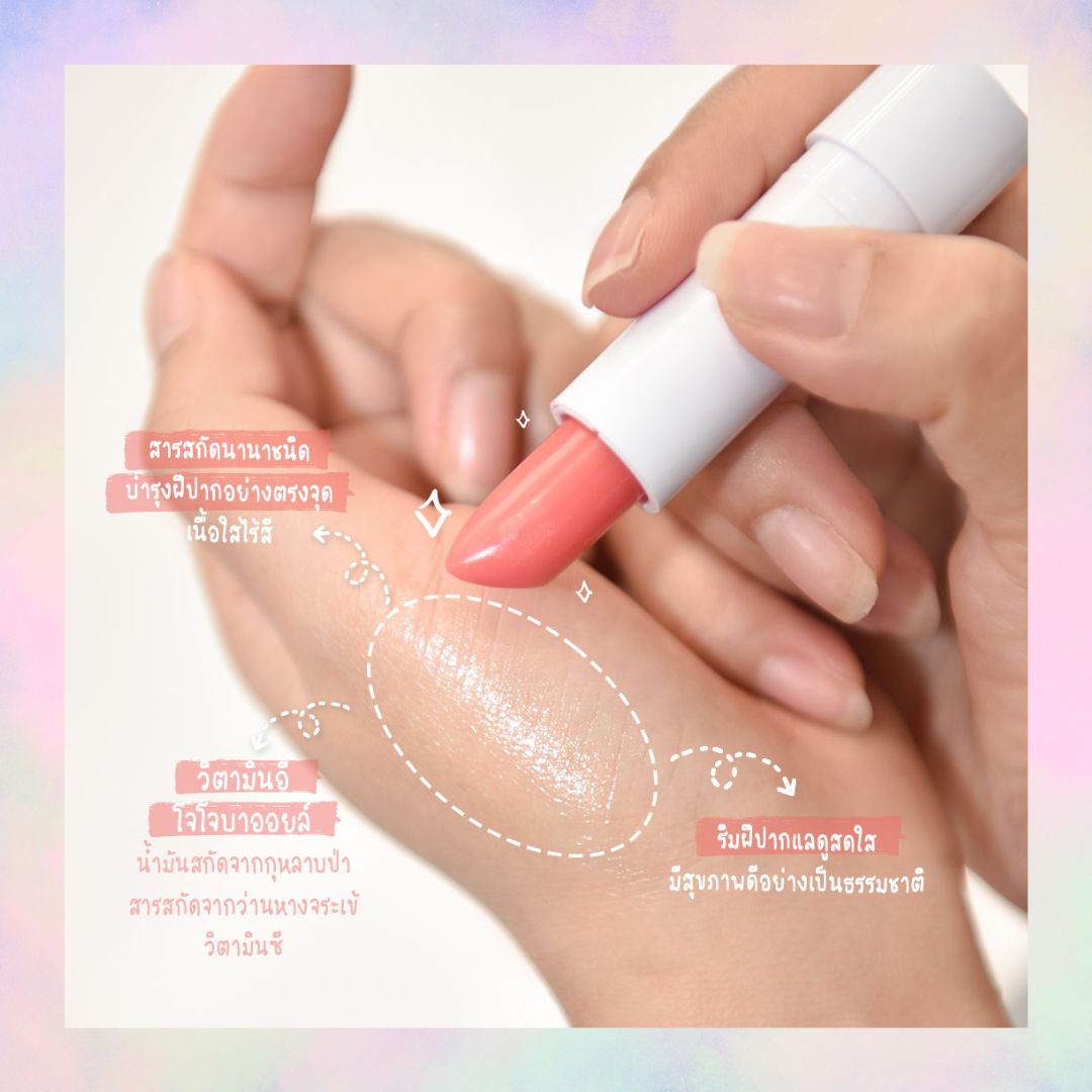 ลิปบาล์มกลิ่นผลไม้ หอมละมุน ที่มอบสัมผัสนุ่มลื่น ช่วยรักษาความชุ่มชื่น ทำให้ริมฝีปากแลดูอ่อนวัย มีสุขภาพดี ผสานการบำรุงจากสารสกัดนานาชนิด อาทิเช่น อนุพันธ์จากวิตามินอี โจโจบาออยล์ น้ำมันสกัดจากกุหลาบป่า สารสกัดจากว่านหางจระเข้ และอนุพันธ์วิตามินซี บำรุงริมฝีปากให้แลดูสดใส มีสุขภาพดีอย่างเป็นธรรมชาติ